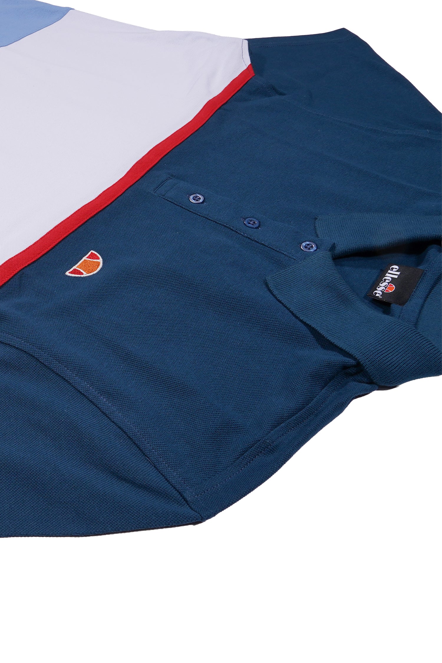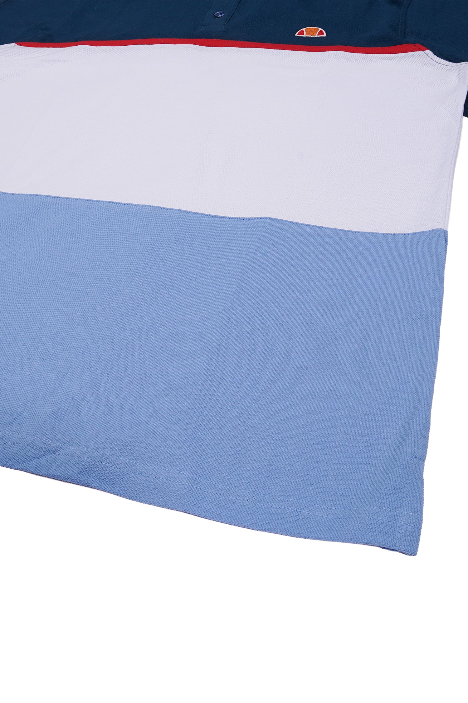 camisa polo com modelagem regular e visual inspirado no estilo esportivo italiano. O design tricolor combina faixas horizontais em azul índigo, branco e azul claro, com um detalhe vermelho contrastante entre as cores superiores. A logo pequena no peito esquerdo completa o visual esportivo.